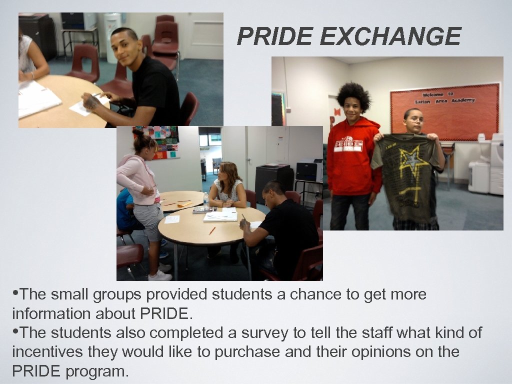 PRIDE EXCHANGE • The small groups provided students a chance to get more information about PRIDE. • The students also completed a survey to tell the staff what kind of incentives they would like to purchase and their opinions on the PRIDE program.