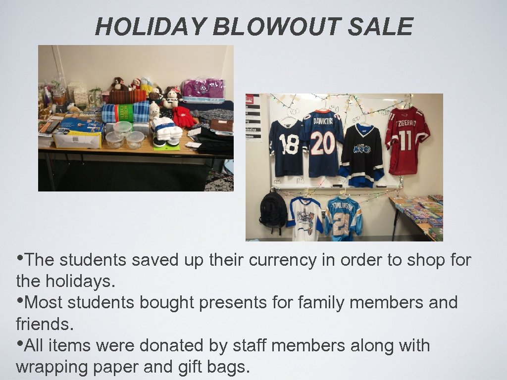 HOLIDAY BLOWOUT SALE • The students saved up their currency in order to shop for the holidays. • Most students bought presents for family members and friends. • All items were donated by staff members along with wrapping paper and gift bags.