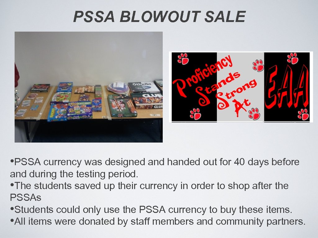 PSSA BLOWOUT SALE • PSSA currency was designed and handed out for 40 days before and during the testing period. • The students saved up their currency in order to shop after the PSSAs • Students could only use the PSSA currency to buy these items. • All items were donated by staff members and community partners.