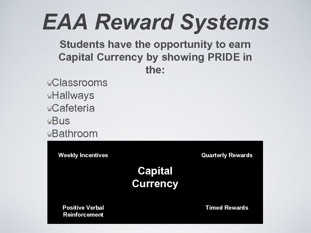 EAA Reward Systems Students have the opportunity to earn Capital Currency by showing PRIDE in the: Classrooms Hallways Cafeteria Bus Bathroom Weekly Incentives. Students are rewarded by: Quarterly Rewards Capital Currency Positive Verbal Reinforcement Timed Rewards