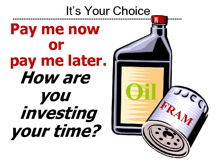 It’s Your Choice Pay me now or pay me later. How are you investing your time? Oil FR AM