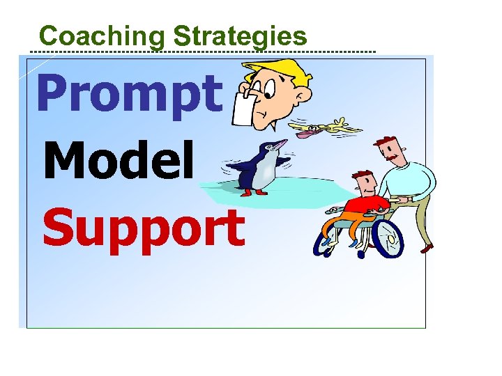 Support Strategies Support: To promote and advocate the interests of an individual by providing materials and equipment and/or removing administrative barriers and obstacles. “Jim, let’s check out that electric wheelchair so you can go to the store by yourself. ”