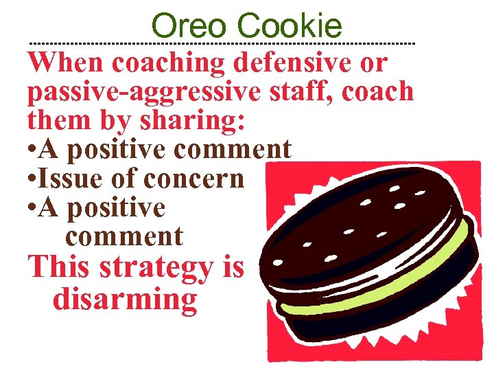 Oreo Cookie When coaching defensive or passive-aggressive staff, coach them by sharing: • A positive comment • Issue of concern • A positive comment This strategy is disarming