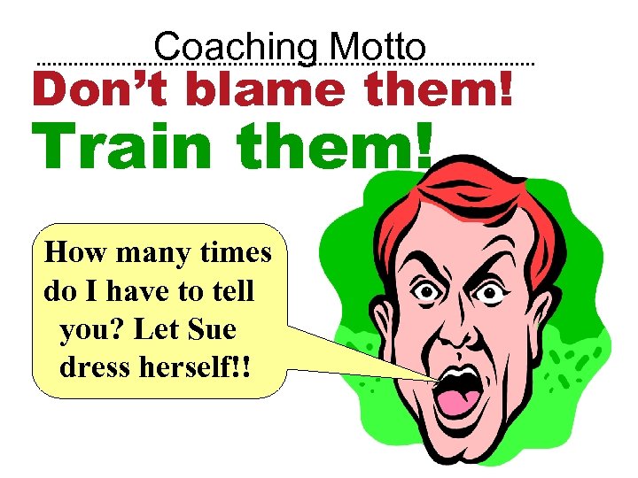 Coaching Motto Don’t blame them! Train them! How many times do I have to tell you? Let Sue dress herself!!