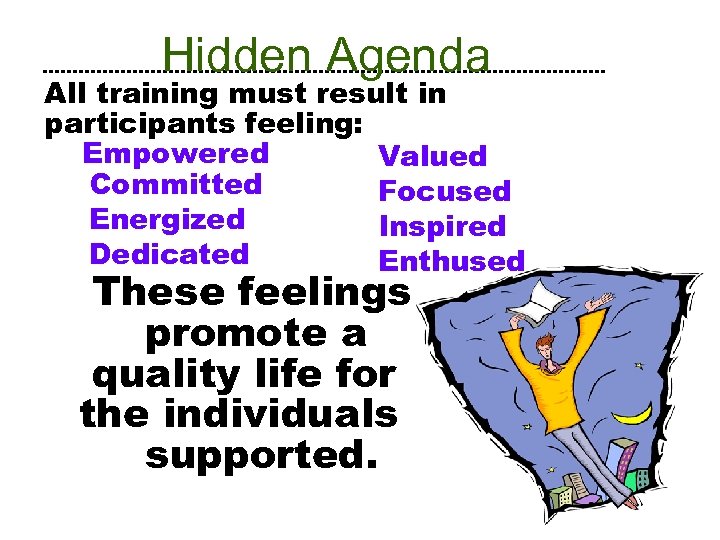 Hidden Agenda All training must result in participants feeling: Empowered Valued Committed Focused Energized Inspired Dedicated Enthused These feelings promote a quality life for the individuals supported.