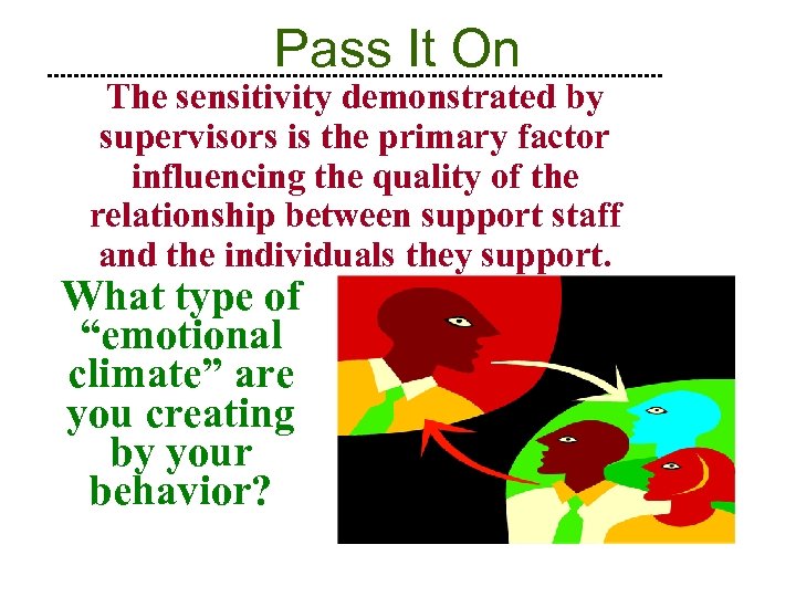 Pass It On The sensitivity demonstrated by supervisors is the primary factor influencing the quality of the relationship between support staff and the individuals they support. What type of “emotional climate” are you creating by your behavior?