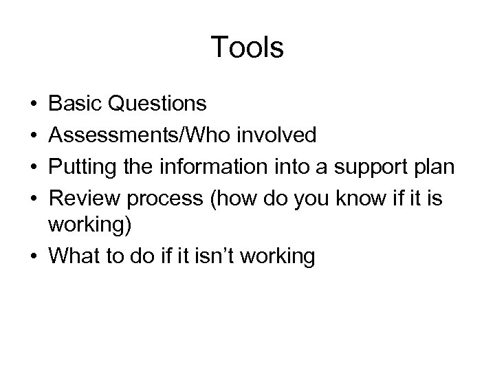 Tools • • Basic Questions Assessments/Who involved Putting the information into a support plan Review process (how do you know if it is working) • What to do if it isn’t working