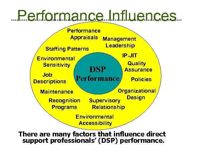 Performance Influences Performance Appraisals Management Leadership Staffing Patterns IP-JIT Environmental Quality Sensitivity Assurance Job Performance Policies Descriptions DSP Maintenance Recognition Programs Organizational Design Supervisory Relationship Environmental Accessibility There are many factors that influence direct support professionals’ (DSP) performance.