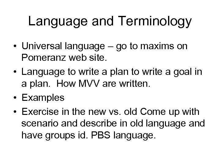 Language and Terminology • Universal language – go to maxims on Pomeranz web site. • Language to write a plan to write a goal in a plan. How MVV are written. • Examples • Exercise in the new vs. old Come up with scenario and describe in old language and have groups id. PBS language.