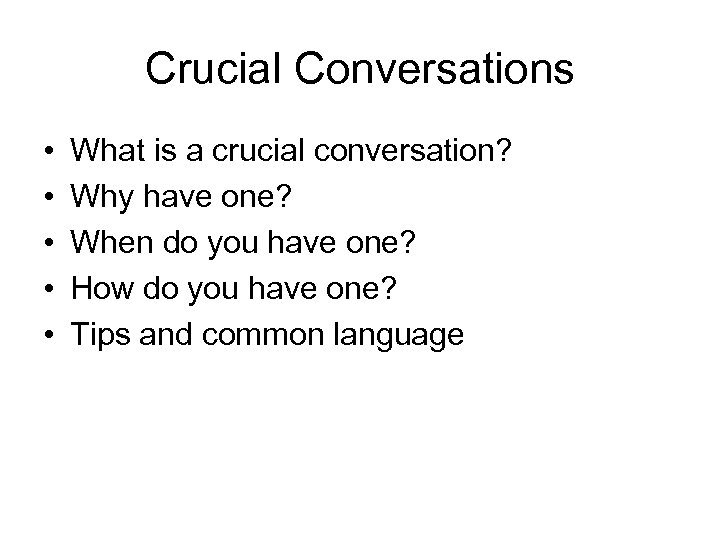Crucial Conversations • • • What is a crucial conversation? Why have one? When do you have one? How do you have one? Tips and common language