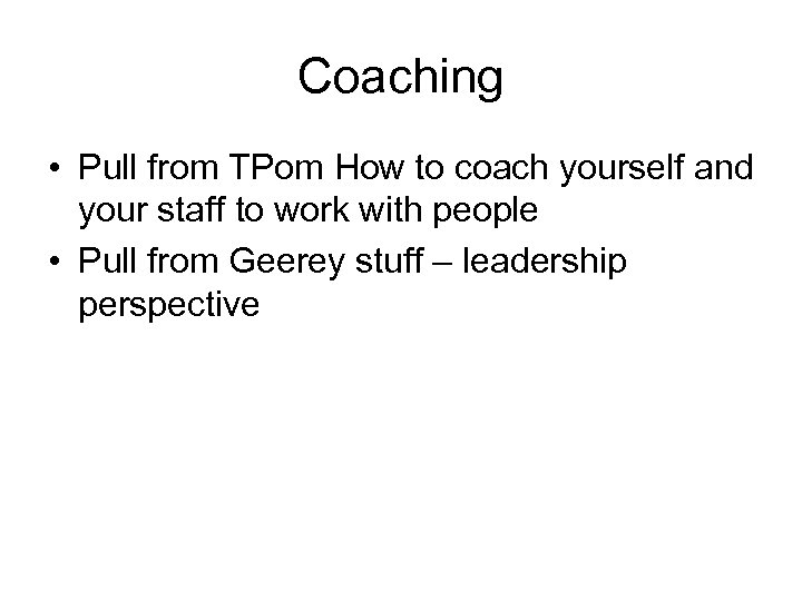 Coaching • Pull from TPom How to coach yourself and your staff to work with people • Pull from Geerey stuff – leadership perspective
