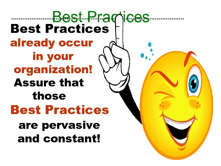 Best Practices already occur in your organization! Assure that those Best Practices are pervasive and constant!