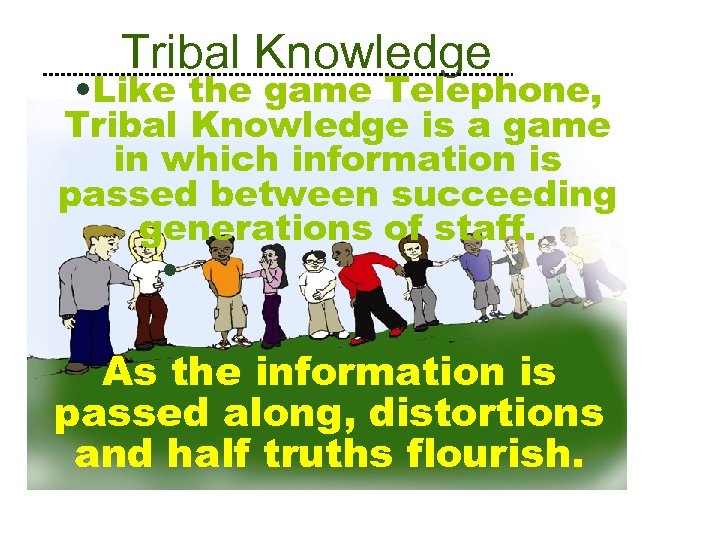 Tribal Knowledge • Like the game Telephone, Tribal Knowledge is a game in which information is passed between succeeding generations of staff. • As the information is passed along, distortions and half truths flourish.