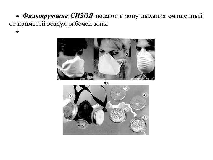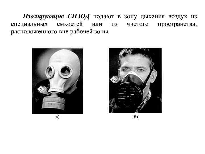 СИЗОД классифицируют по принципу действия и назначению. По принципу действия СИЗОД делятся в зависимости от способа обеспечения защиты на: Фильтрующие Изолирующие очищают вдыхаемый воздух от вредных веществ с помощью фильтров, сорбентов и поглотителей, входящих в конструкцию данного СИЗОД это СИЗОД, с помощью которых органы дыхания человека изолируются от окружающей среды, а воздух для дыхания поступает из чистой зоны или из источника дыхательной смеси, являющегося составной частью СИЗОД. Они имеют систему для подачи чистого воздуха или кислорода из незагрязненного источника. применяют в условиях известного состава и концентрации вредных веществ. Они имеют систему очистки, принцип защитного действия которой основан на очистке вдыхаемого загрязненного воздуха путем сорбции, и/или фильтрации прохождении его во время вдоха через фильтр. в случаях недостаточного содержания кислорода, а также в условиях неизвестного состава вредных веществ и/или когда не обеспечивается защита фильтрующими СИЗОД (то есть в тех случаях, когда требуется более высокая степень защиты).