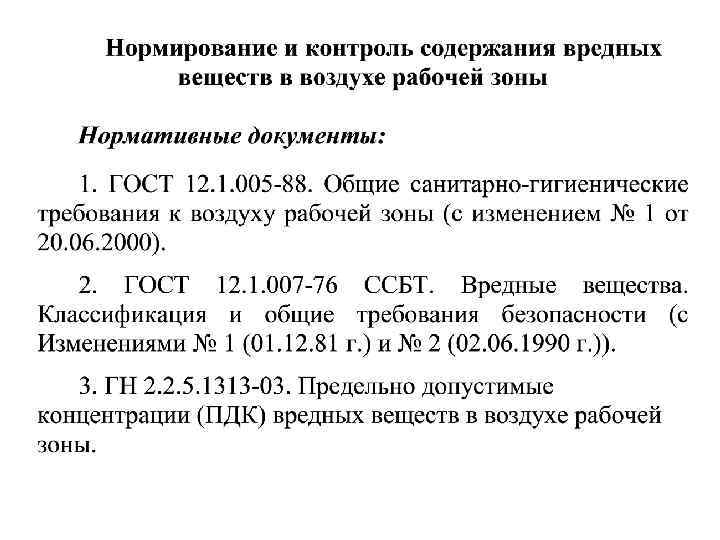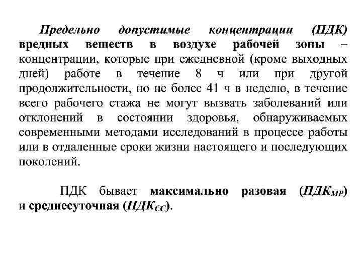 • ПДКмр – концентрация вредного вещества при выполнении операций (или на этапах технологического процесса), сопровождающихся максимальным выделением вещества в воздух рабочей зоны. • ПДКсс – средняя из числа концентраций, выявленных в течение суток, или отбираемая непрерывно в течение 24 ч. Установлена для предупреждения общетоксического, канцерогенного, мутагенного и др. влияния вещества на организм человека.