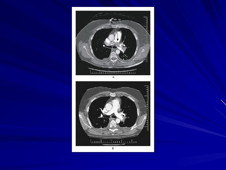 EKG May have non specific ST and T wave changes “Typical” SI, QIII, TIII - rare. Sinus tachycardia T wave inversions in right to mid chest leads Poor R wave progression (acute RV dilation) P pulmonale RV conduction delays Right axis shift