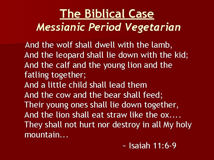 The Biblical Case Messianic Period Vegetarian And the wolf shall dwell with the lamb, And the leopard shall lie down with the kid; And the calf and the young lion and the fatling together; And a little child shall lead them And the cow and the bear shall feed; Their young ones shall lie down together, And the lion shall eat straw like the ox. . They shall not hurt nor destroy in all My holy mountain. . . ~ Isaiah 11: 6 -9