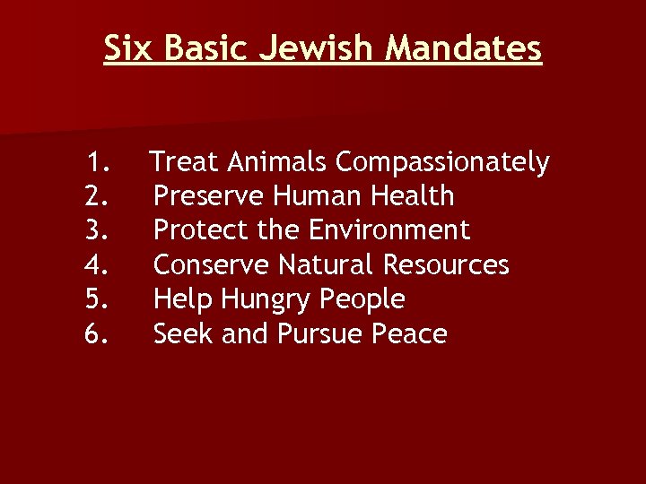 Six Basic Jewish Mandates 1. Treat Animals Compassionately 2. Preserve Human Health 3. Protect the Environment 4. Conserve Natural Resources 5. Help Hungry People 6. Seek and Pursue Peace