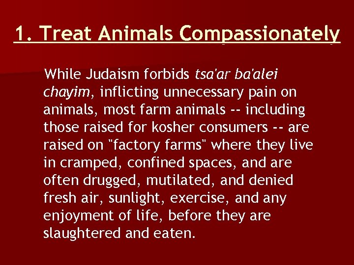 1. Treat Animals Compassionately While Judaism forbids tsa'ar ba'alei chayim, inflicting unnecessary pain on animals, most farm animals -- including those raised for kosher consumers -- are raised on "factory farms" where they live in cramped, confined spaces, and are often drugged, mutilated, and denied fresh air, sunlight, exercise, and any enjoyment of life, before they are slaughtered and eaten.