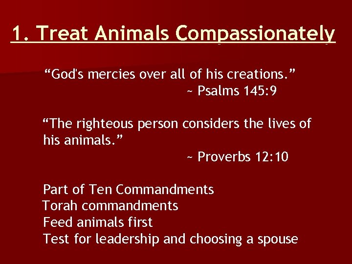 1. Treat Animals Compassionately “God's mercies over all of his creations. ” ~ Psalms 145: 9 “The righteous person considers the lives of his animals. ” ~ Proverbs 12: 10 Part of Ten Commandments Torah commandments Feed animals first Test for leadership and choosing a spouse