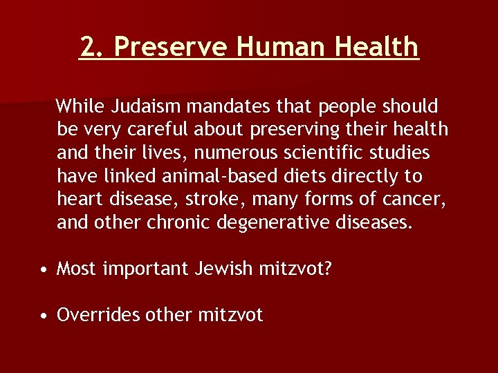 2. Preserve Human Health While Judaism mandates that people should be very careful about preserving their health and their lives, numerous scientific studies have linked animal-based diets directly to heart disease, stroke, many forms of cancer, and other chronic degenerative diseases. • Most important Jewish mitzvot? • Overrides other mitzvot