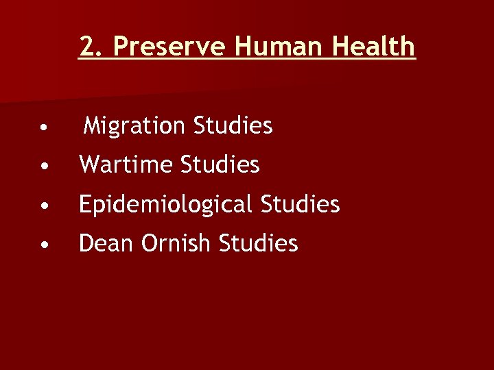 2. Preserve Human Health • Migration Studies • Wartime Studies • Epidemiological Studies • Dean Ornish Studies