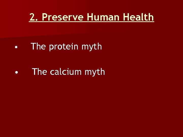 2. Preserve Human Health • The protein myth • The calcium myth