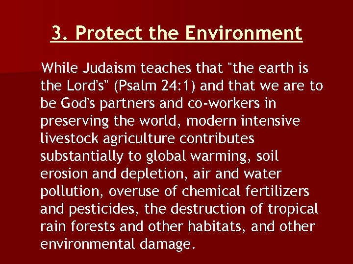 3. Protect the Environment While Judaism teaches that "the earth is the Lord's" (Psalm 24: 1) and that we are to be God's partners and co-workers in preserving the world, modern intensive livestock agriculture contributes substantially to global warming, soil erosion and depletion, air and water pollution, overuse of chemical fertilizers and pesticides, the destruction of tropical rain forests and other habitats, and other environmental damage.