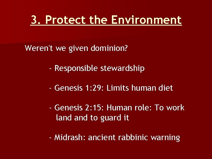 3. Protect the Environment Weren't we given dominion? - Responsible stewardship - Genesis 1: 29: Limits human diet - Genesis 2: 15: Human role: To work land to guard it - Midrash: ancient rabbinic warning
