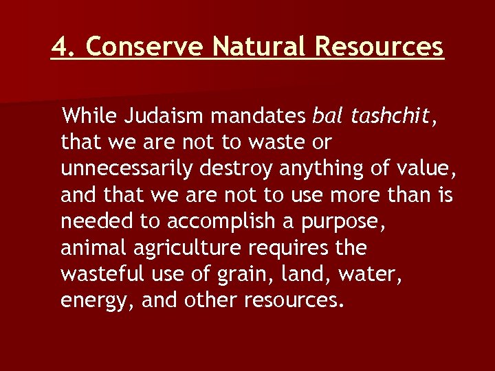 4. Conserve Natural Resources While Judaism mandates bal tashchit, that we are not to waste or unnecessarily destroy anything of value, and that we are not to use more than is needed to accomplish a purpose, animal agriculture requires the wasteful use of grain, land, water, energy, and other resources.