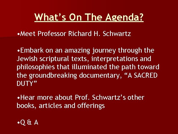 What’s On The Agenda? • Meet Professor Richard H. Schwartz • Embark on an amazing journey through the Jewish scriptural texts, interpretations and philosophies that illuminated the path toward the groundbreaking documentary, “A SACRED DUTY” • Hear more about Prof. Schwartz’s other books, articles and offerings • Q & A