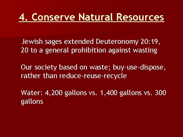 4. Conserve Natural Resources Jewish sages extended Deuteronomy 20: 19, 20 to a general prohibition against wasting Our society based on waste; buy-use-dispose, rather than reduce-reuse-recycle Water: 4, 200 gallons vs. 1, 400 gallons vs. 300 gallons