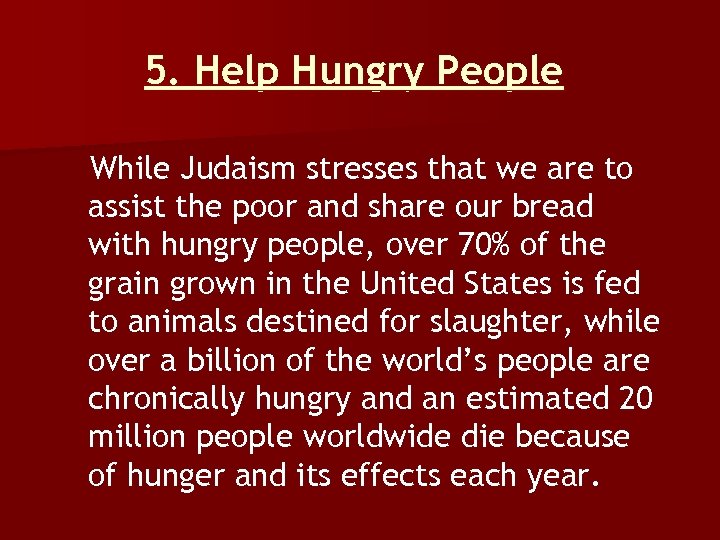 5. Help Hungry People While Judaism stresses that we are to assist the poor and share our bread with hungry people, over 70% of the grain grown in the United States is fed to animals destined for slaughter, while over a billion of the world’s people are chronically hungry and an estimated 20 million people worldwide die because of hunger and its effects each year.