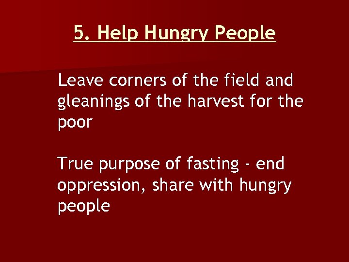 5. Help Hungry People Leave corners of the field and gleanings of the harvest for the poor True purpose of fasting - end oppression, share with hungry people