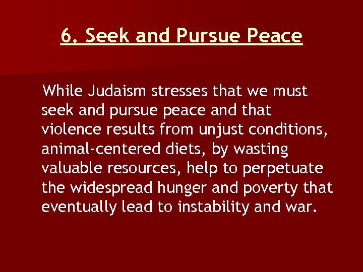 6. Seek and Pursue Peace While Judaism stresses that we must seek and pursue peace and that violence results from unjust conditions, animal-centered diets, by wasting valuable resources, help to perpetuate the widespread hunger and poverty that eventually lead to instability and war.