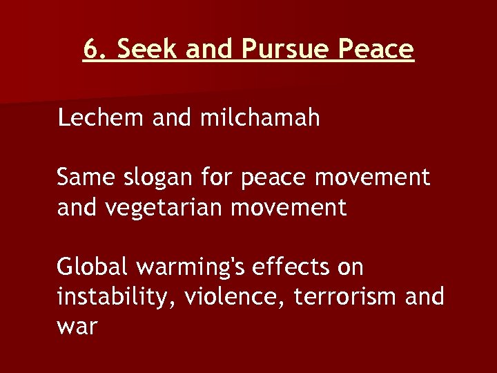 6. Seek and Pursue Peace Lechem and milchamah Same slogan for peace movement and vegetarian movement Global warming's effects on instability, violence, terrorism and war