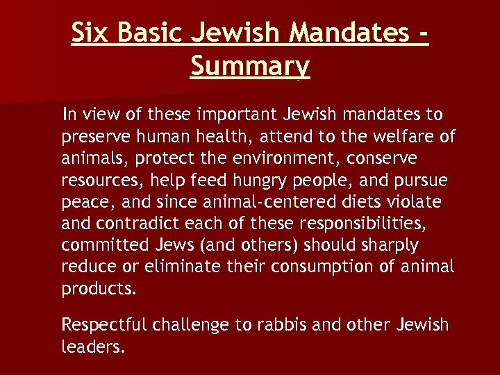 Six Basic Jewish Mandates Summary In view of these important Jewish mandates to preserve human health, attend to the welfare of animals, protect the environment, conserve resources, help feed hungry people, and pursue peace, and since animal-centered diets violate and contradict each of these responsibilities, committed Jews (and others) should sharply reduce or eliminate their consumption of animal products. Respectful challenge to rabbis and other Jewish leaders.
