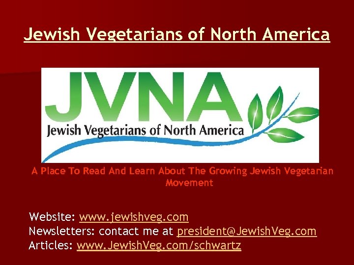Jewish Vegetarians of North America A Place To Read And Learn About The Growing Jewish Vegetarian Movement Website: www. jewishveg. com Newsletters: contact me at president@Jewish. Veg. com Articles: www. Jewish. Veg. com/schwartz