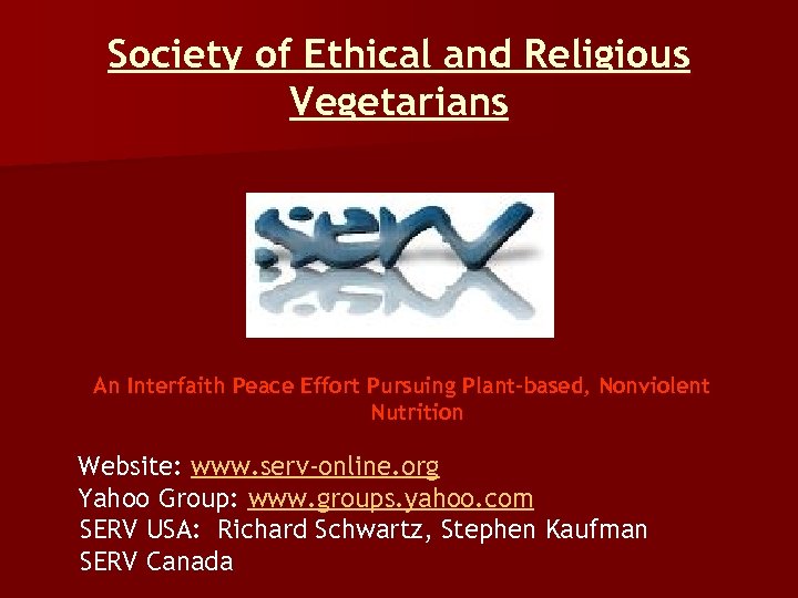 Society of Ethical and Religious Vegetarians An Interfaith Peace Effort Pursuing Plant-based, Nonviolent Nutrition Website: www. serv-online. org Yahoo Group: www. groups. yahoo. com SERV USA: Richard Schwartz, Stephen Kaufman SERV Canada