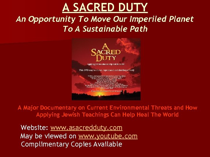A SACRED DUTY An Opportunity To Move Our Imperiled Planet To A Sustainable Path A Major Documentary on Current Environmental Threats and How Applying Jewish Teachings Can Help Heal The World Website: www. asacredduty. com May be viewed on www. youtube. com Complimentary Copies Available