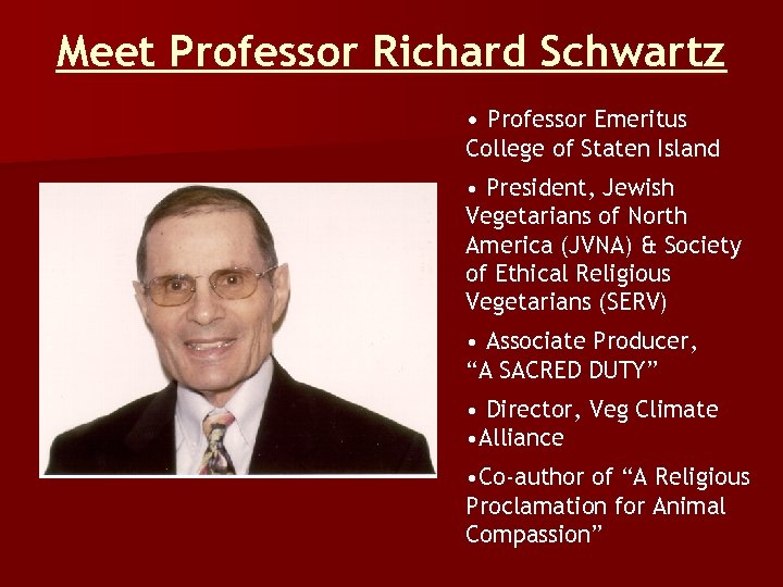 Meet Professor Richard Schwartz • Professor Emeritus College of Staten Island • President, Jewish Vegetarians of North America (JVNA) & Society of Ethical Religious Vegetarians (SERV) • Associate Producer, “A SACRED DUTY” • Director, Veg Climate • Alliance • Co-author of “A Religious Proclamation for Animal Compassion”