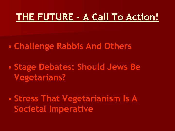 THE FUTURE – A Call To Action! • Challenge Rabbis And Others • Stage Debates: Should Jews Be Vegetarians? • Stress That Vegetarianism Is A Societal Imperative