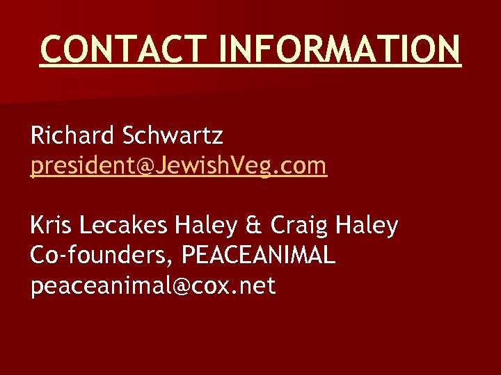 CONTACT INFORMATION Richard Schwartz president@Jewish. Veg. com Kris Lecakes Haley & Craig Haley Co-founders, PEACEANIMAL peaceanimal@cox. net