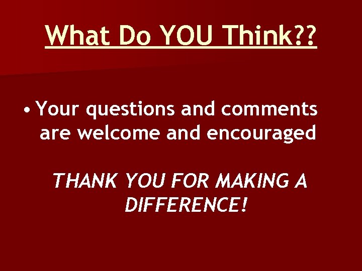 What Do YOU Think? ? • Your questions and comments are welcome and encouraged THANK YOU FOR MAKING A DIFFERENCE!