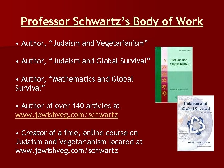 Professor Schwartz’s Body of Work • Author, “Judaism and Vegetarianism” • Author, “Judaism and Global Survival” • Author, “Mathematics and Global Survival” • Author of over 140 articles at www. jewishveg. com/schwartz • Creator of a free, online course on Judaism and Vegetarianism located at www. jewishveg. com/schwartz