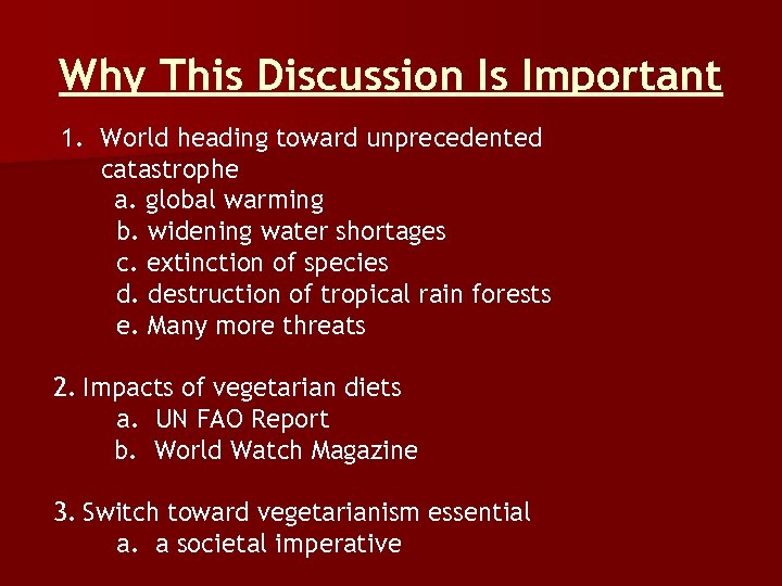Why This Discussion Is Important 1. World heading toward unprecedented catastrophe a. global warming b. widening water shortages c. extinction of species d. destruction of tropical rain forests e. Many more threats 2. Impacts of vegetarian diets a. UN FAO Report b. World Watch Magazine 3. Switch toward vegetarianism essential a. a societal imperative