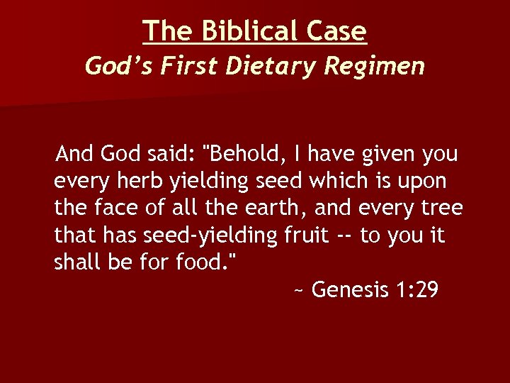 The Biblical Case God’s First Dietary Regimen And God said: "Behold, I have given you every herb yielding seed which is upon the face of all the earth, and every tree that has seed-yielding fruit -- to you it shall be for food. " ~ Genesis 1: 29