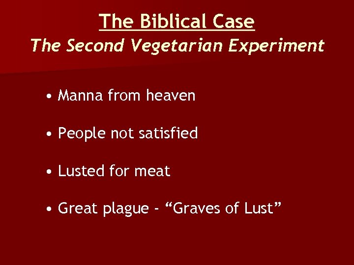 The Biblical Case The Second Vegetarian Experiment • Manna from heaven • People not satisfied • Lusted for meat • Great plague - “Graves of Lust”