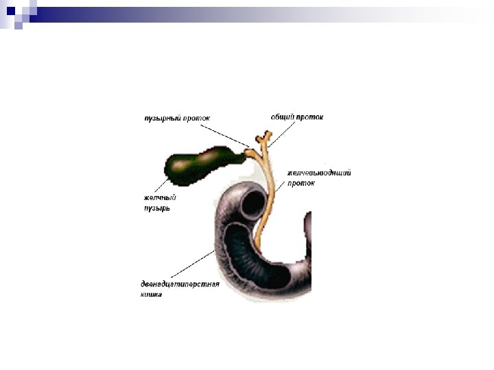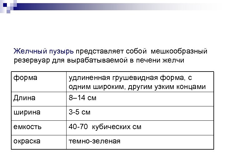 Желчный пузырь представляет собой мешкообразный резервуар для вырабатываемой в печени желчи форма удлиненная грушевидная форма, с одним широким, другим узким концами Длина 8– 14 см ширина 3 -5 см емкость 40 -70 кубических см окраска темно-зеленая
