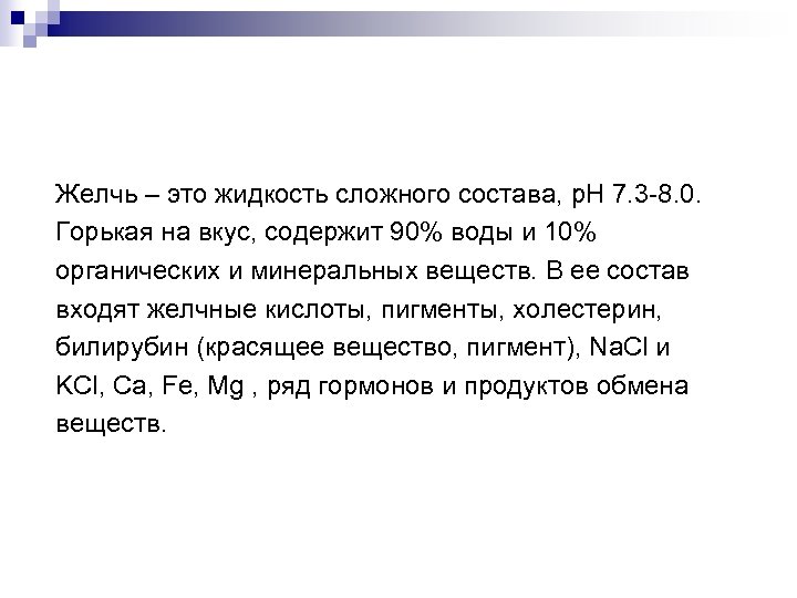 Желчь – это жидкость сложного состава, p. H 7. 3 -8. 0. Горькая на вкус, содержит 90% воды и 10% органических и минеральных веществ. В ее состав входят желчные кислоты, пигменты, холестерин, билирубин (красящее вещество, пигмент), Na. Cl и KCl, Ca, Fe, Mg , ряд гормонов и продуктов обмена веществ.